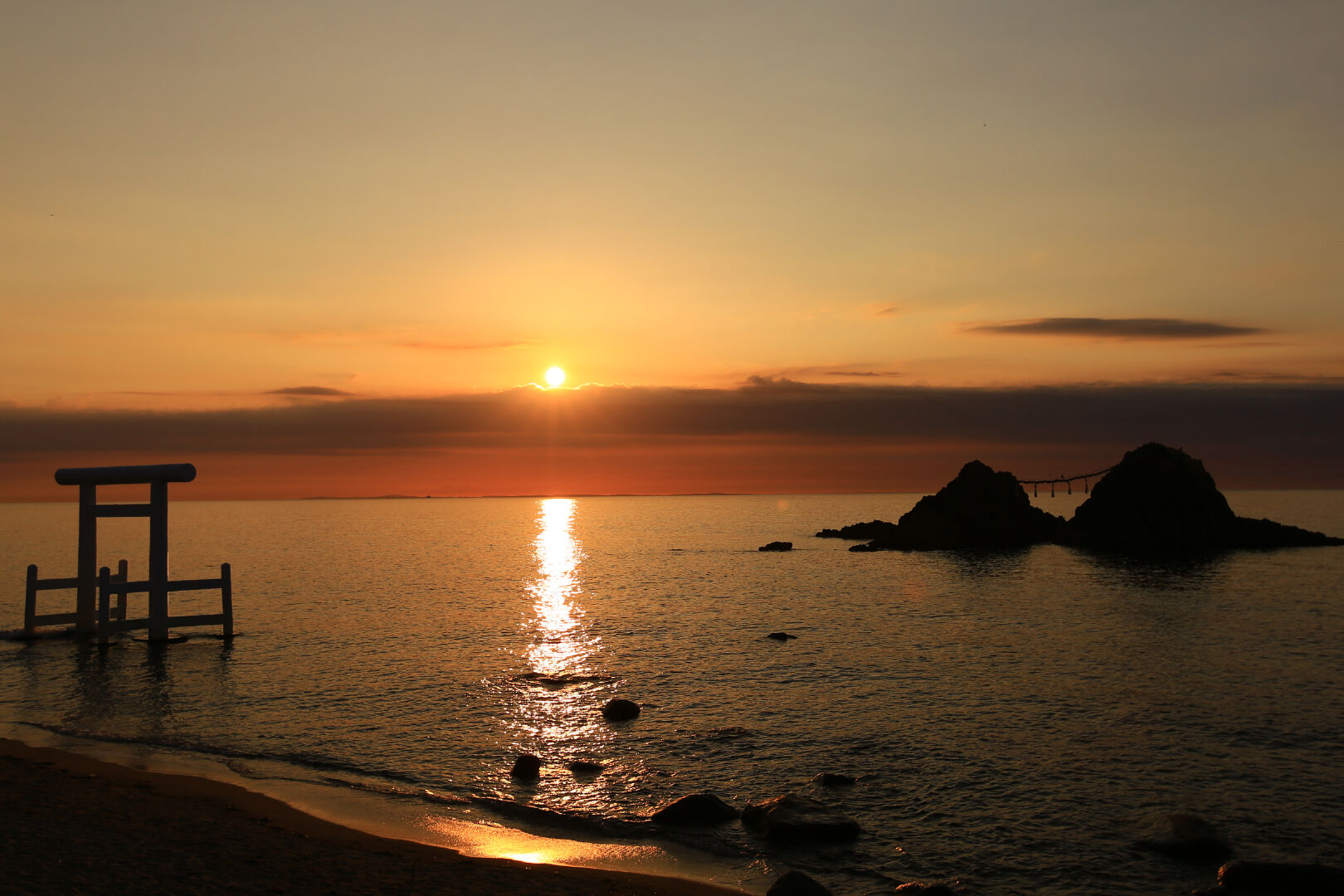 鳥居と夫婦岩が織りなす、神々しい夕景