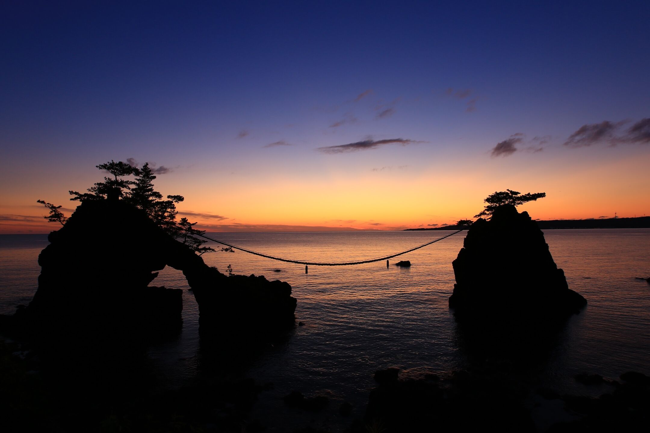 志賀町にある能登金剛の奇岩「機具岩」は、機織りの神様にまつわる夫婦岩で、機織りの道具に似た形からその名が付けられました。16メートルと12メートルの二つの岩が寄