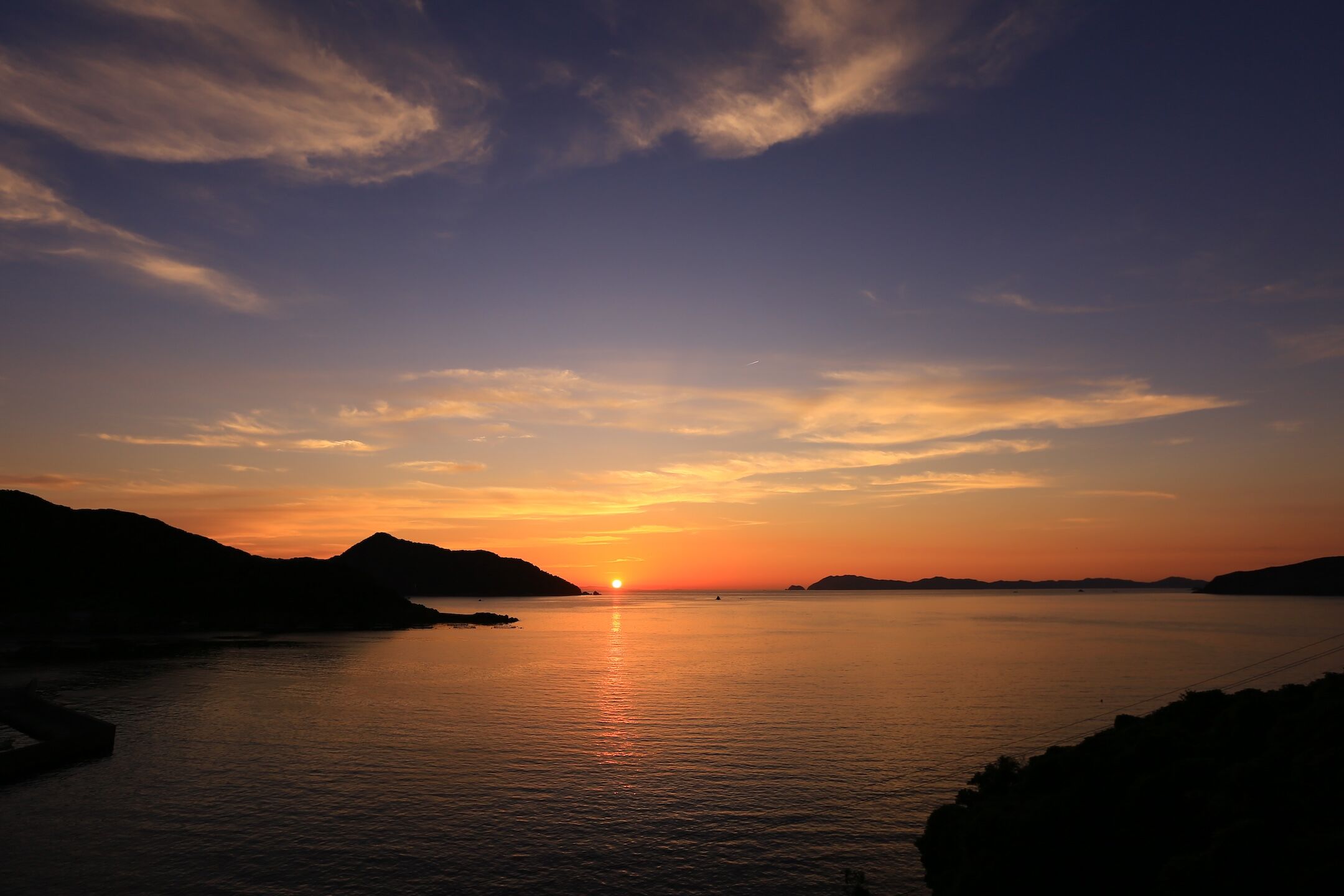 愛媛県愛南町の外泊集落は「石垣の里」として知られ、石垣が斜面に整然と積み上げられた美しい景観です。そこから望む夕景は、特に印象的です。この時、夕日は真っ赤に燃え