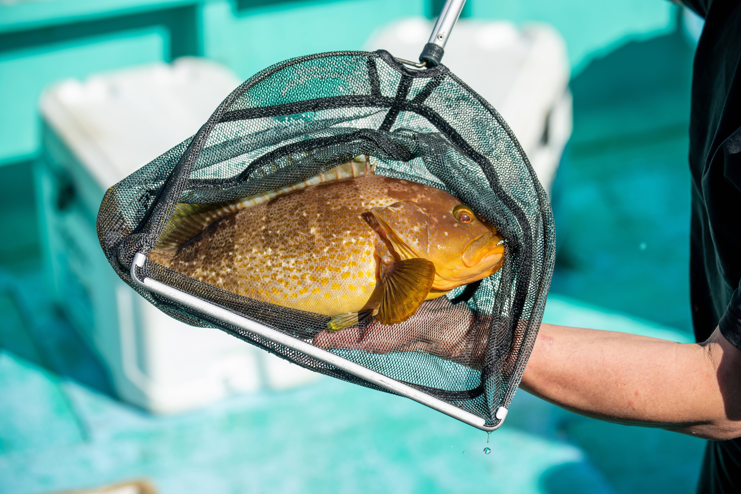 漁船の生け簀から店の生け簀へ。この日は、大きなアオハタが揚がっていました。