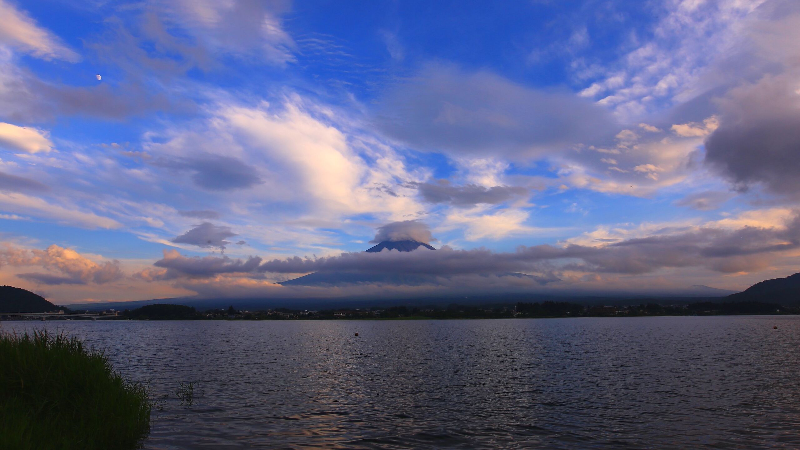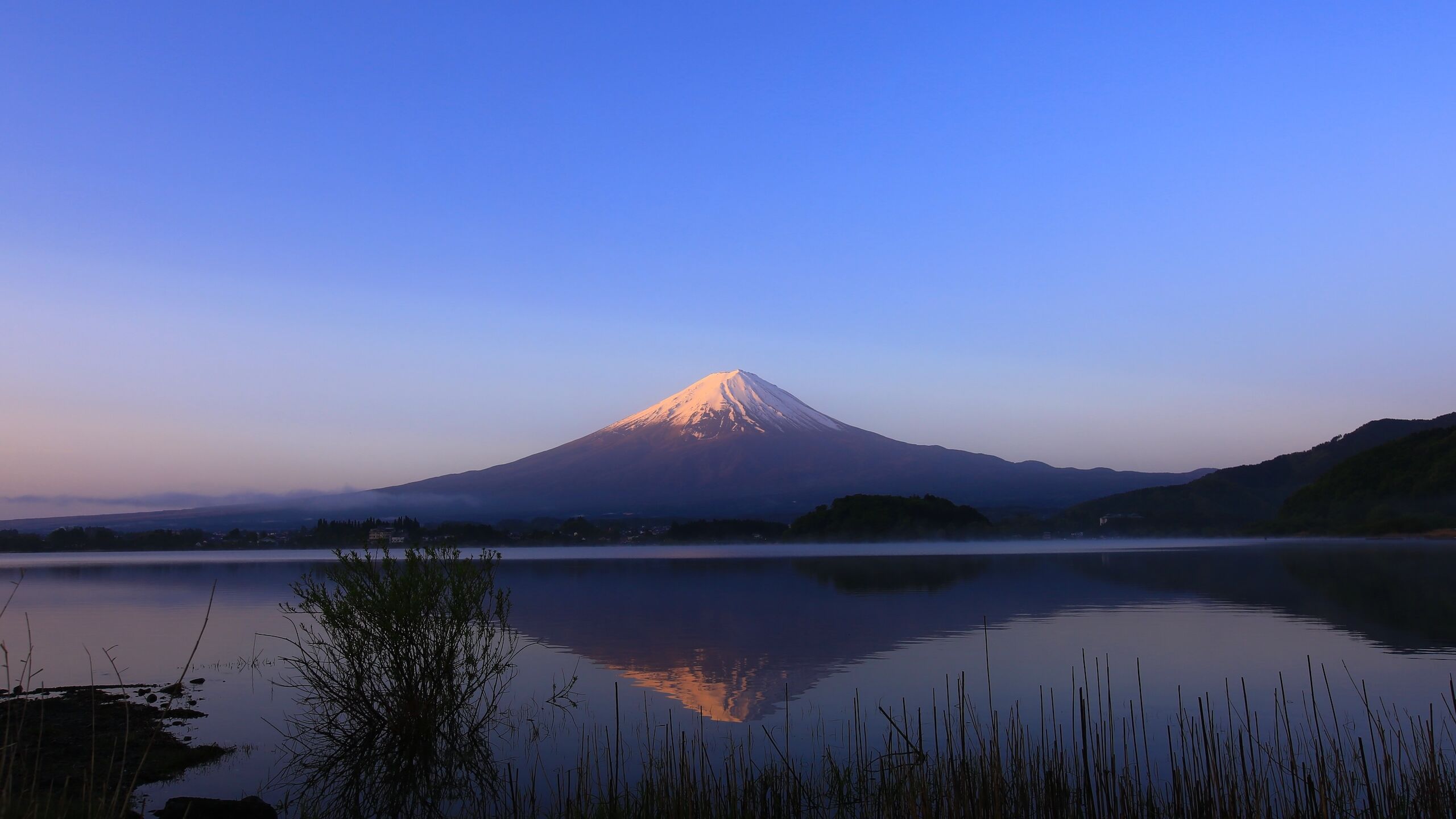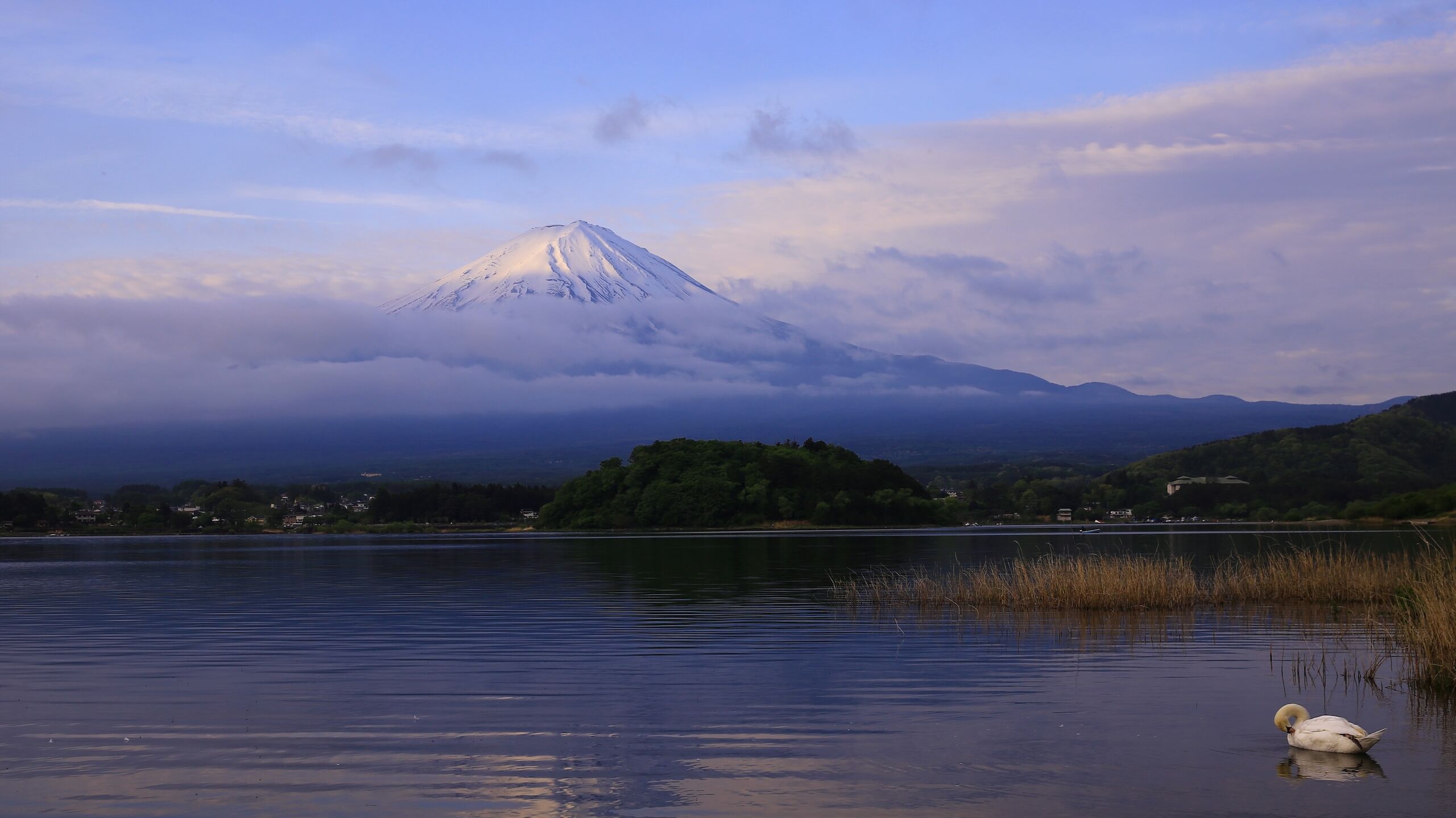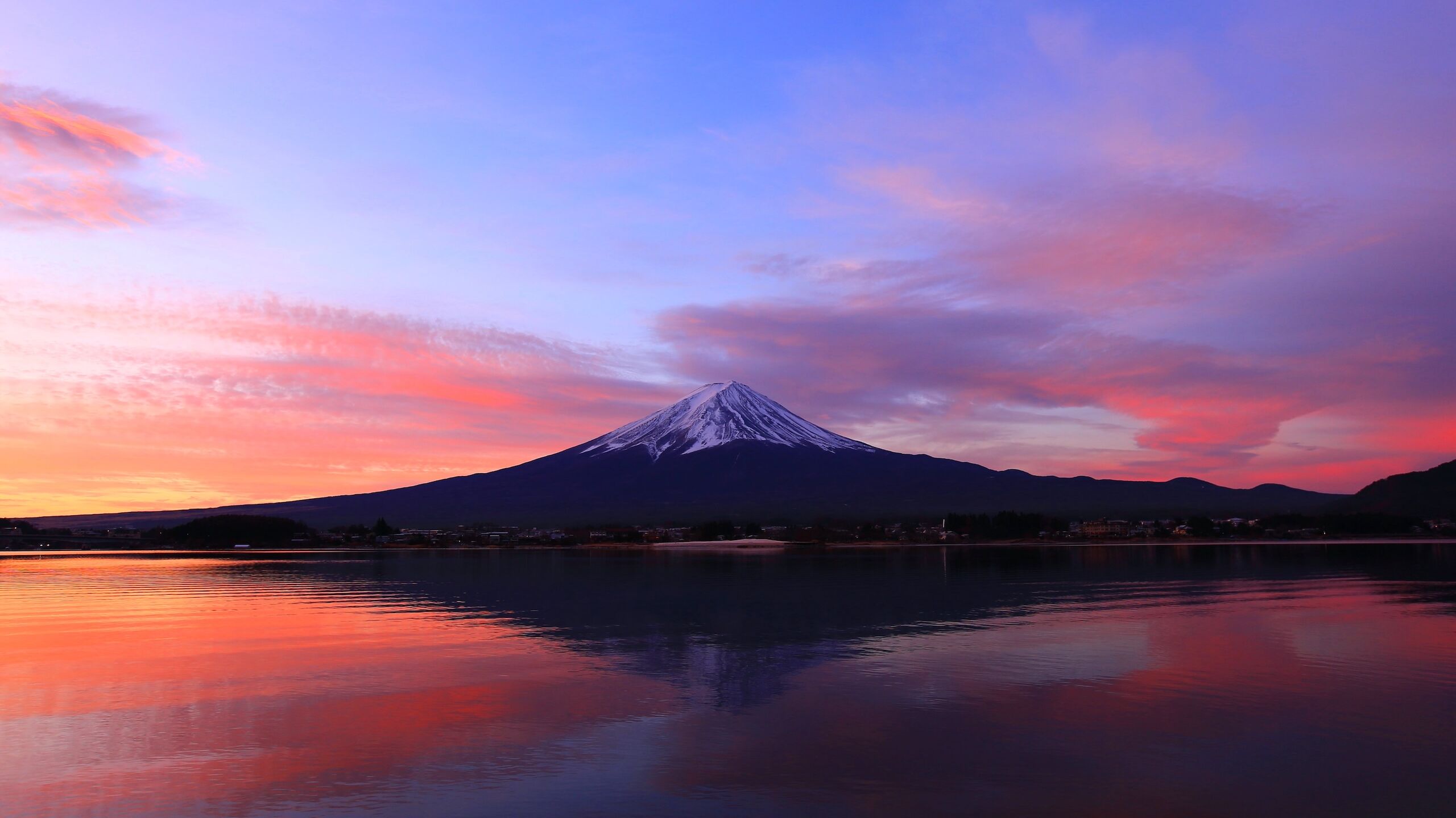 富士五湖の最北端に位置する河口湖は、富士山の真北にあり、湖畔からシンメトリーな美しい稜線の富士山を望むことができます。この河口湖の北側から見る富士山は、まさに独立峰として典型的な美しさを楽しめる絶好のスポットです。春には桜が咲き誇り、夏にはラベンダーが湖畔を彩り、秋には紅葉が映える四季折々の風景とともに、富士山の雄大な姿を堪能できるのが魅力です。