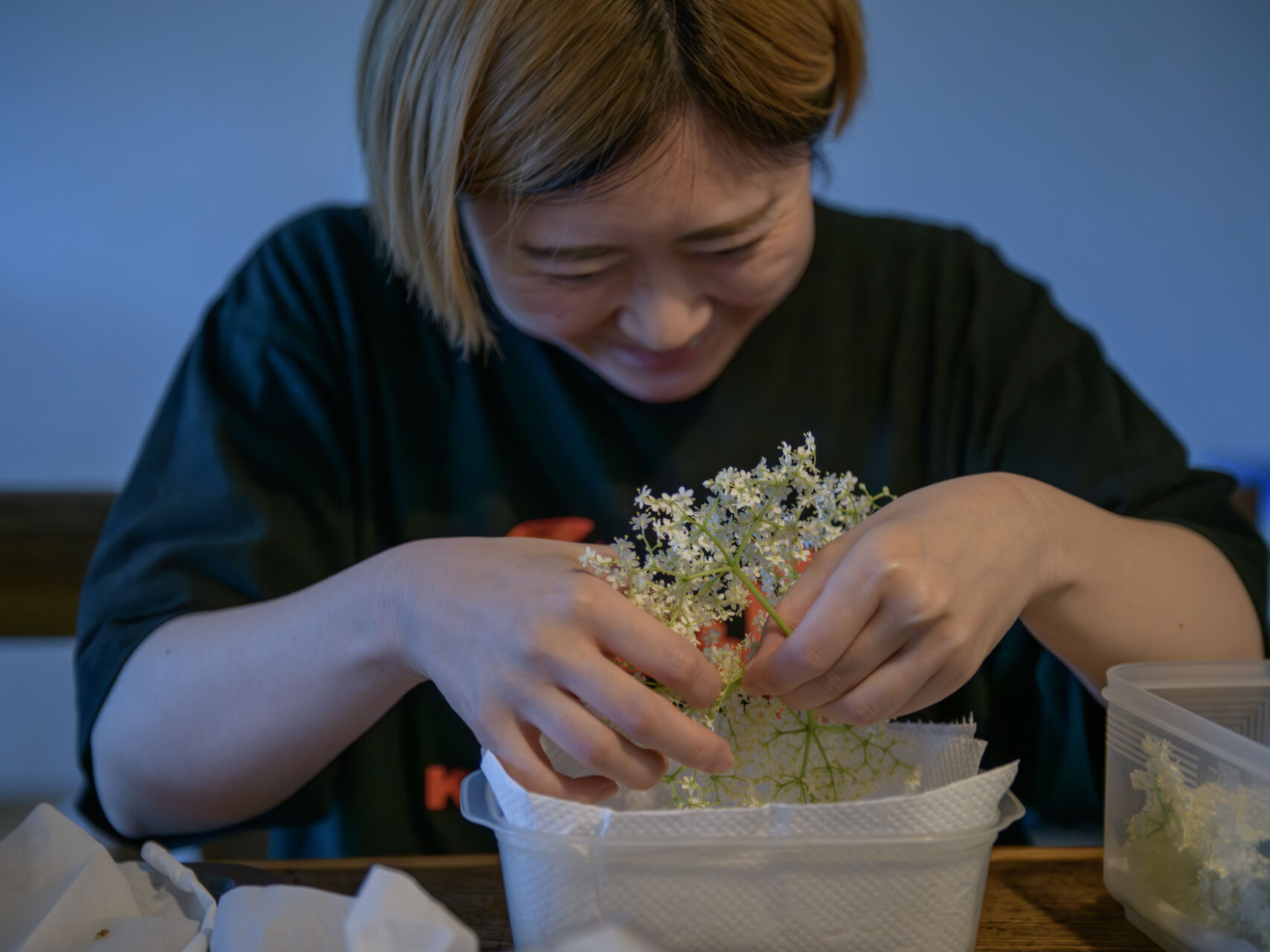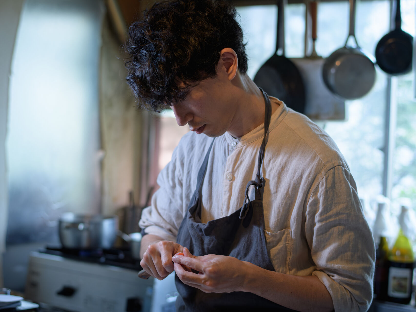 藤田さんは1993年青森市生まれ。八戸市で育ち、高校の食物調理科を卒業後、関東のレストランに就職します。しかし、規模の大きな厨房の流れに馴染めず帰郷。八戸市のビストロワインバーでワインやお茶を習得し、2017年、岡さんの故郷、北津軽郡鶴田町で1日1組完全予約制の「澱と葉」を開きました。