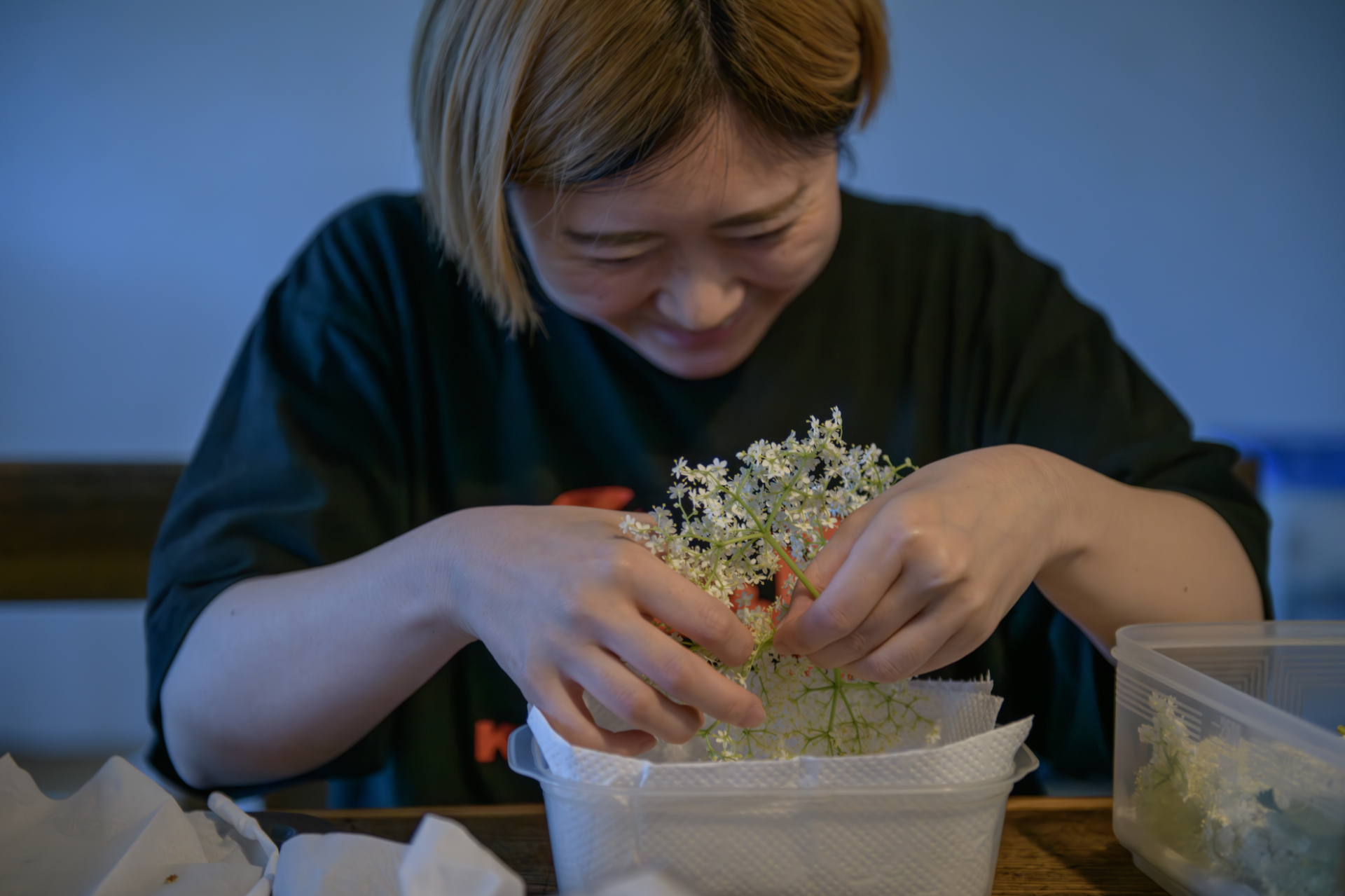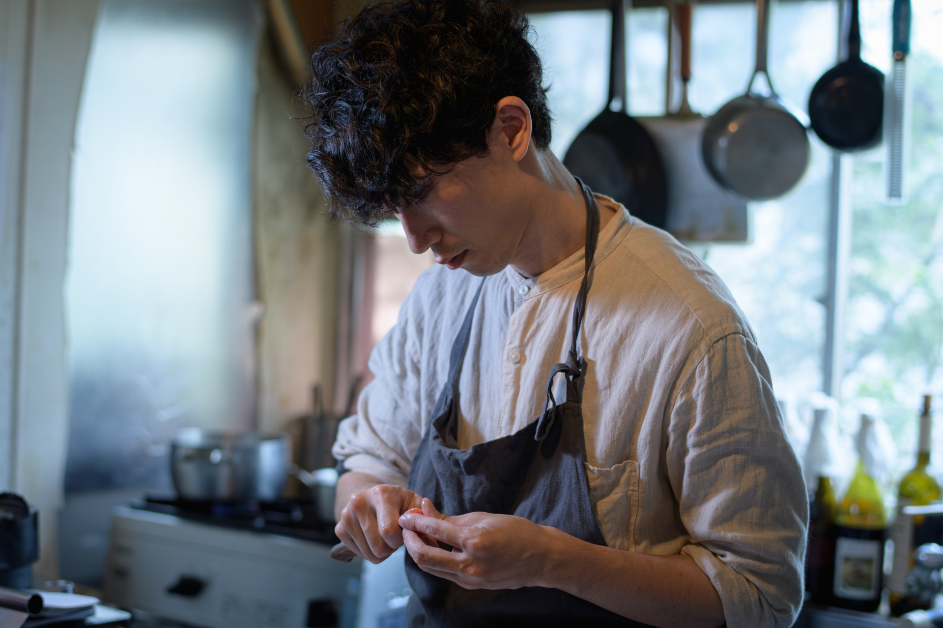 藤田さんは1993年青森市生まれ。八戸市で育ち、高校の食物調理科を卒業後、関東のレストランに就職します。しかし、規模の大きな厨房の流れに馴染めず帰郷。八戸市のビストロワインバーでワインやお茶を習得し、2017年、岡さんの故郷、北津軽郡鶴田町で1日1組完全予約制の「澱と葉」を開きました。