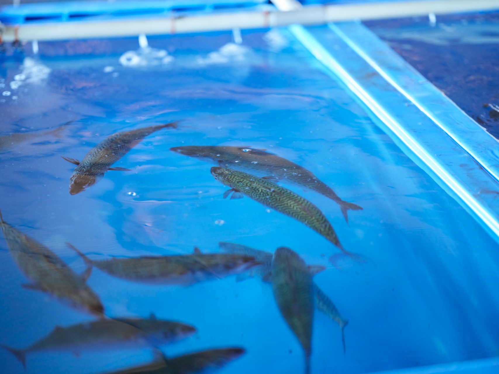 市場の一隅に幾つも置かれた水槽。これが、「游がせ」の現場のようです。