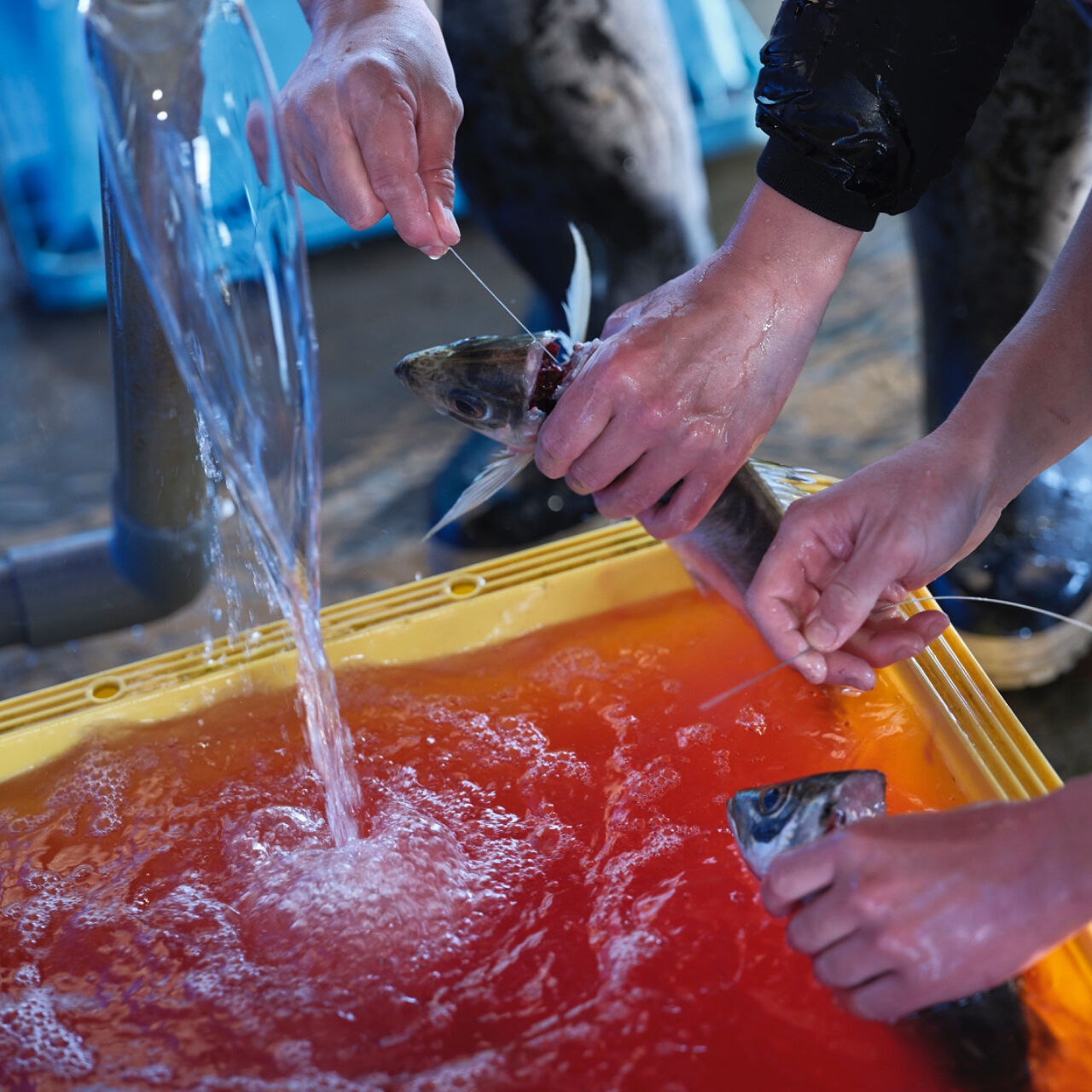 まず、魚にストレスを与えない捕り方をすること。生きたまま港まで運ぶこと。