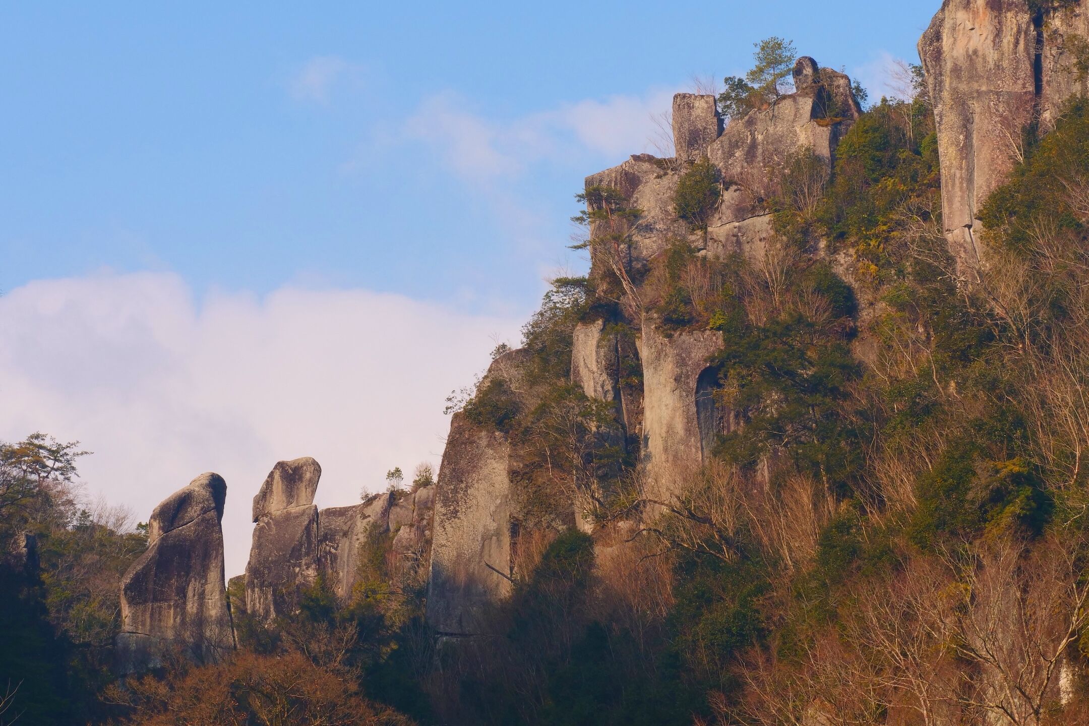 耶馬溪は、大分県中津市に広がる美しい渓谷で、奇岩や断崖が連なる独特の景観が魅力です。江戸時代に僧侶・禅海が手彫りで切り開いた「青の洞門」は、地域の安全を支える歴