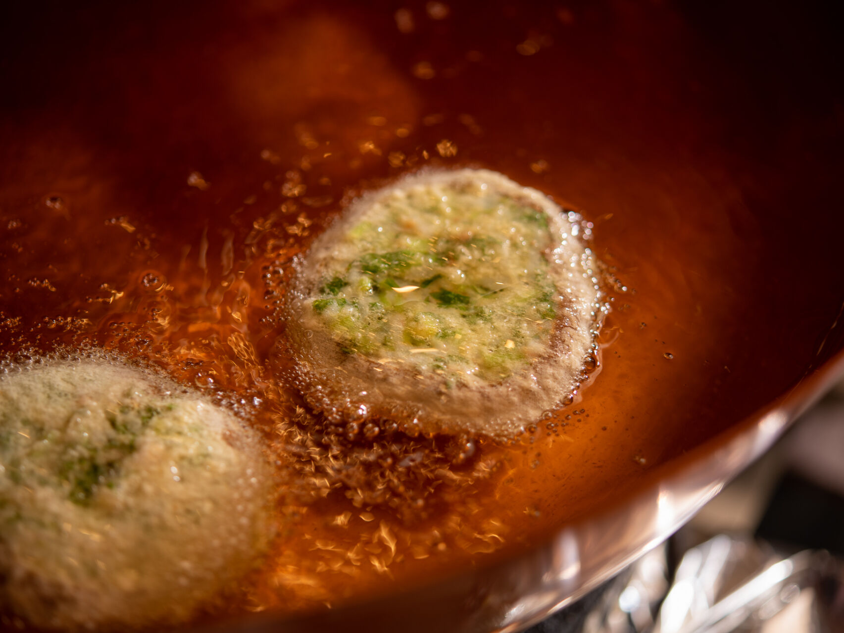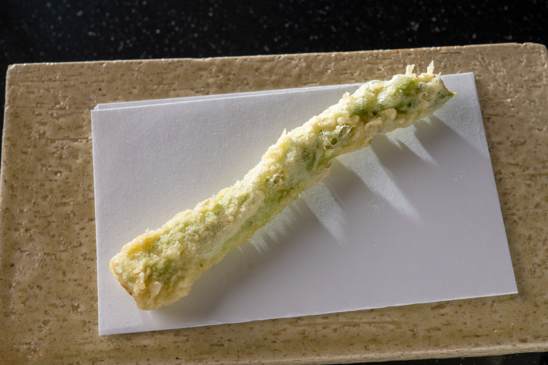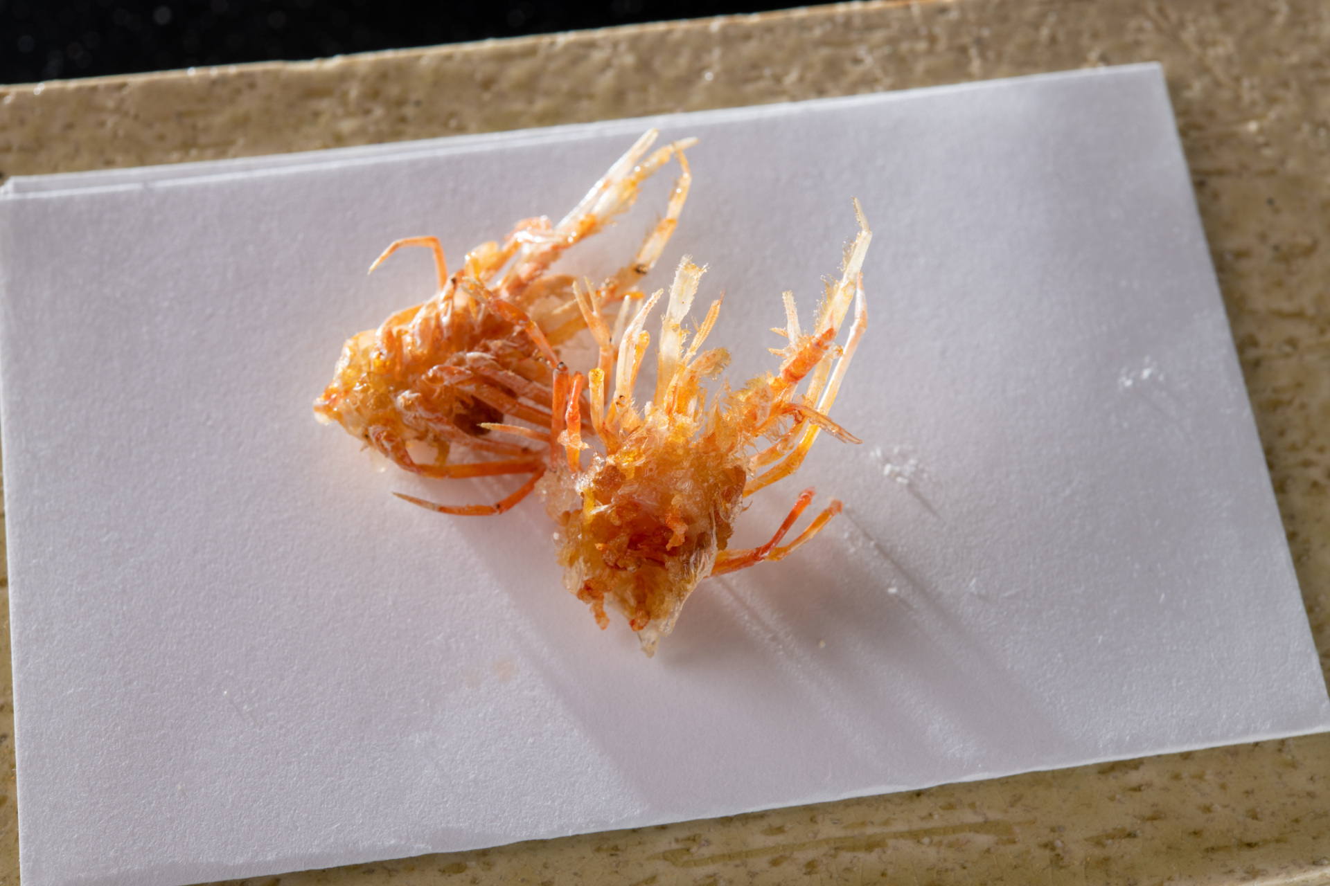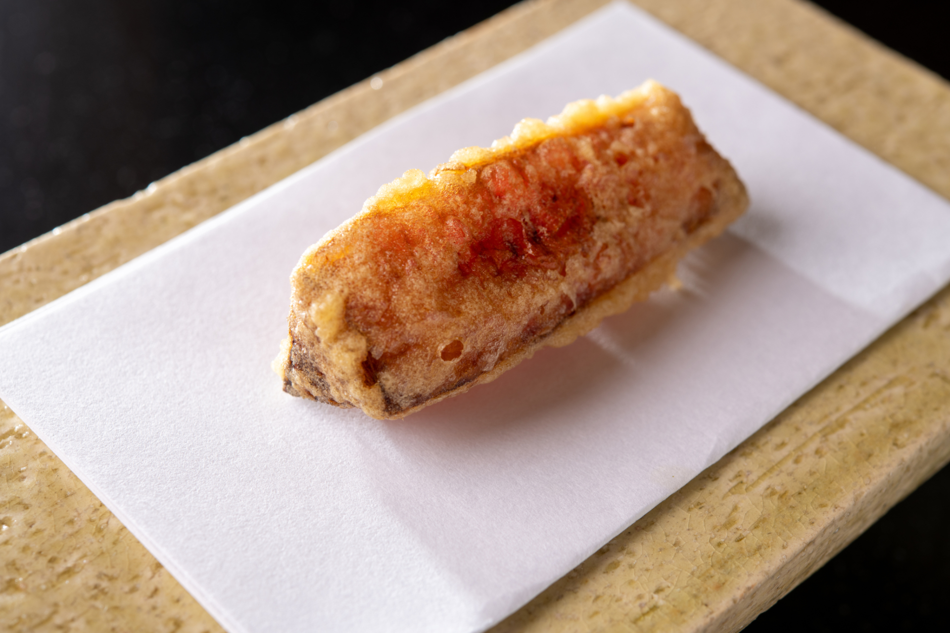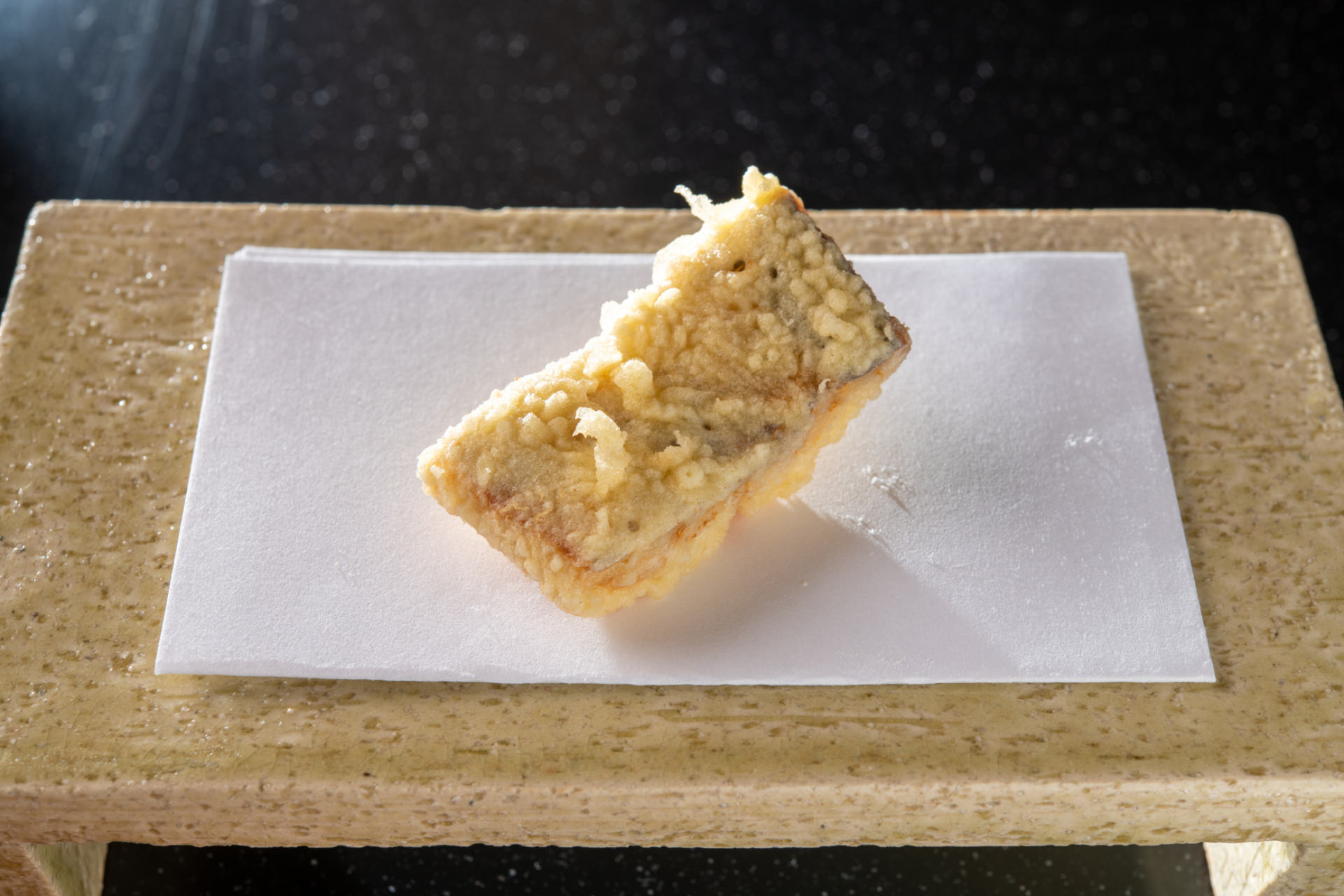 松村さんの天ぷらには、まず、丁寧な下ごしらえがあります。そして、一口いただいた時のサクッとした食感。これは、揚げ鍋に綿実油80%、太白胡麻油を20%の割合でたっぷりと入れ、やや低めの温度で、揚げきることで生まれます。カラッと仕上がり、敷紙に油が染みることはありません。