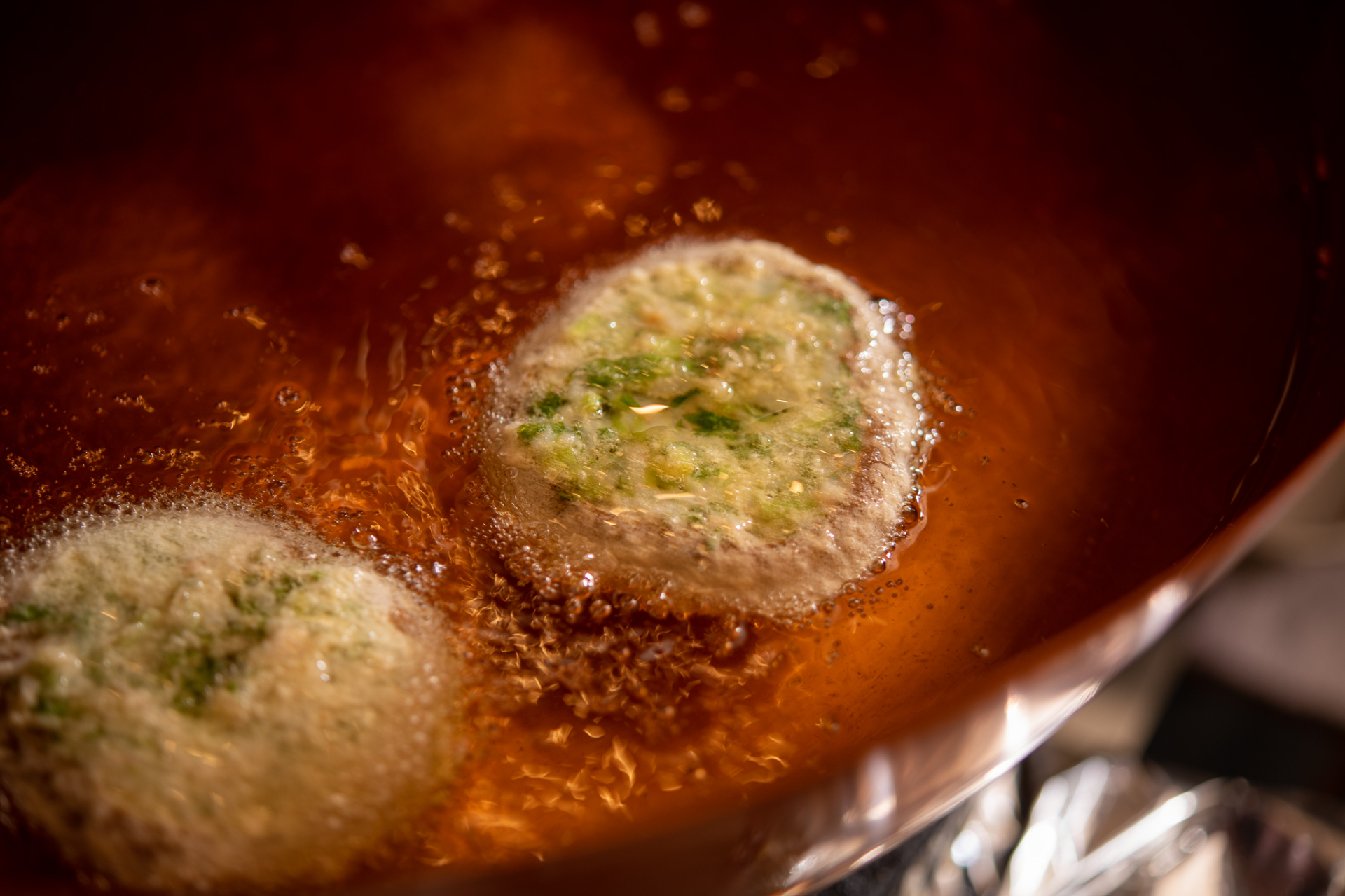 松村さんの天ぷらには、まず、丁寧な下ごしらえがあります。そして、一口いただいた時のサクッとした食感。これは、揚げ鍋に綿実油80%、太白胡麻油を20%の割合でたっぷりと入れ、やや低めの温度で、揚げきることで生まれます。カラッと仕上がり、敷紙に油が染みることはありません。